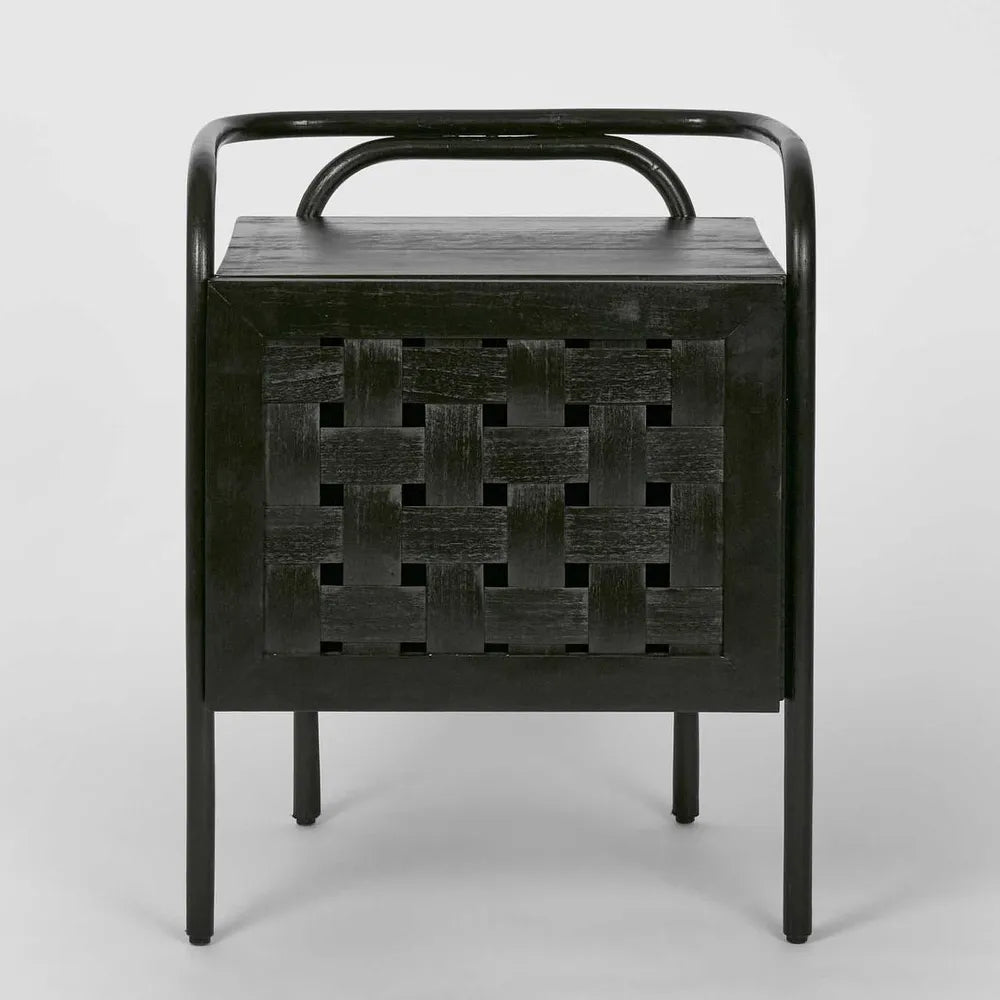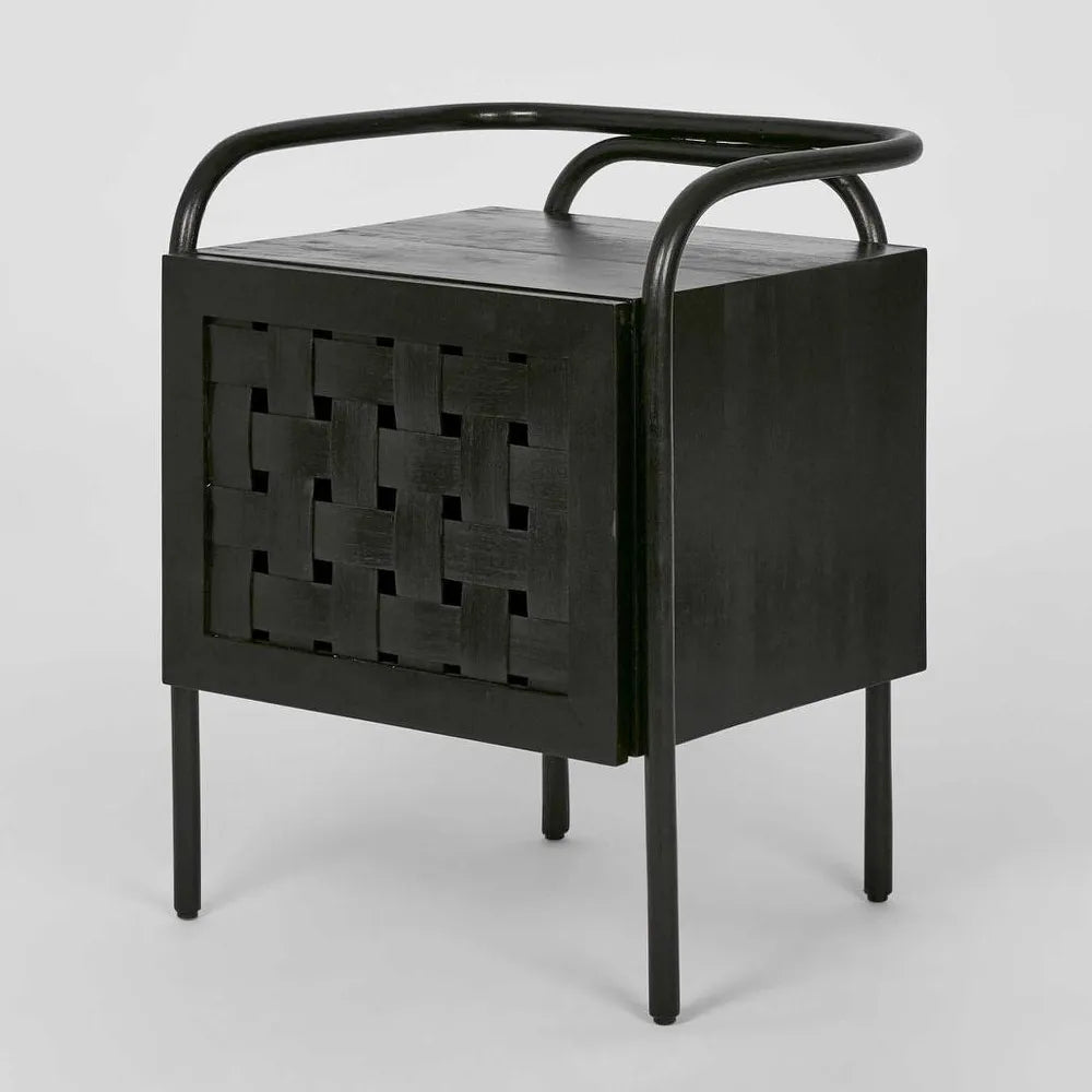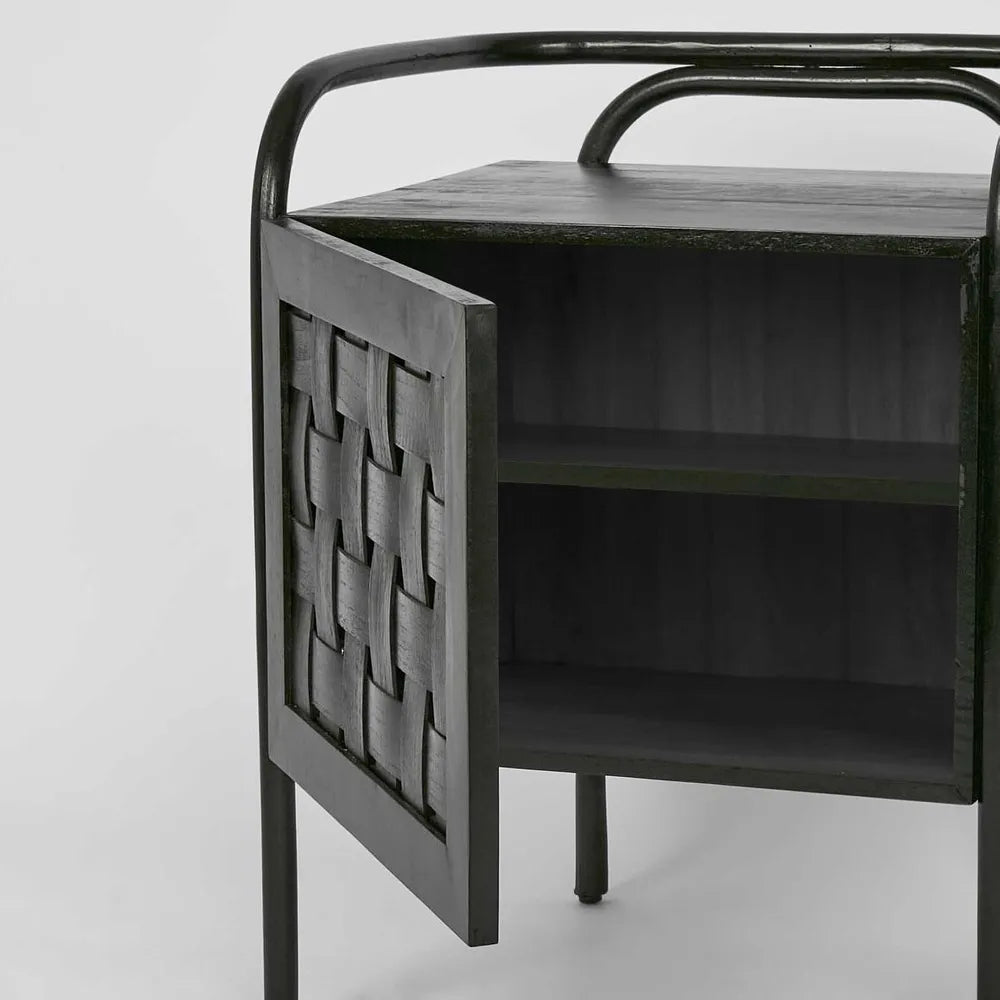 Our Weave Bedside is crafted from a unique mix of materials featuring steam-bent rattan and intricately hand-woven wooden slats on front opening door.