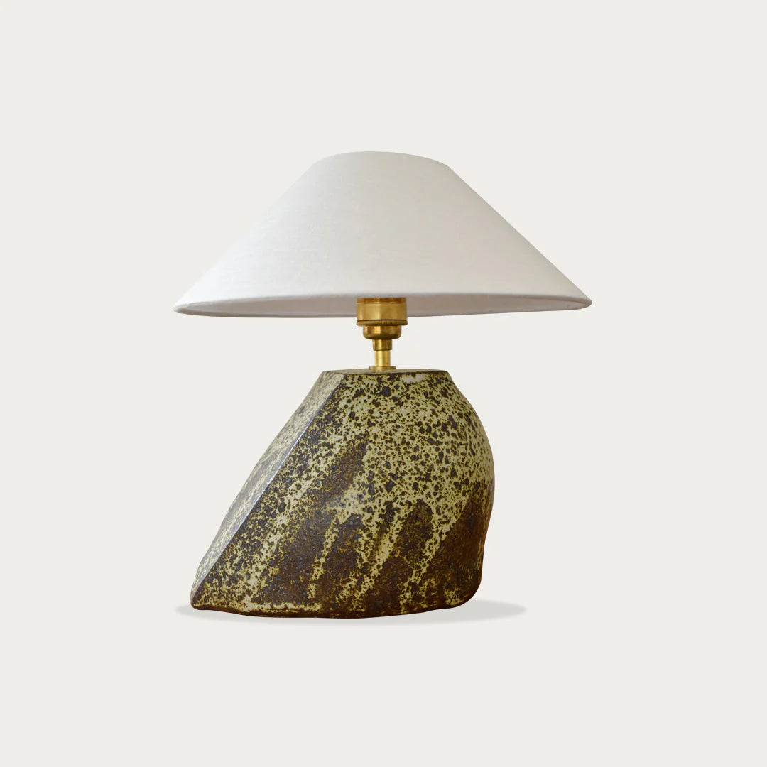 The Ishi Lamp by local artist Caitlin Robson is an angular abstract lamp built using a slab hand building technique. This hollow bodied piece is comprised from a heavily heavily grogged clay with a dark speckled textural finish, when combined with the ivory glaze, the chemical reaction that occurs in the specialty reduction firing creates a truly unique and one-of-a-kind finish on the clay body, making no two lamp bases the same. The round and angular features of the lamp base are inspired from different shapes and forms of stones.