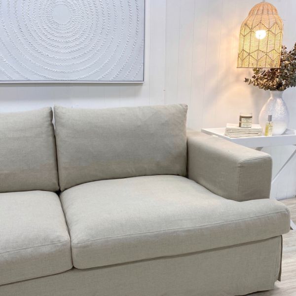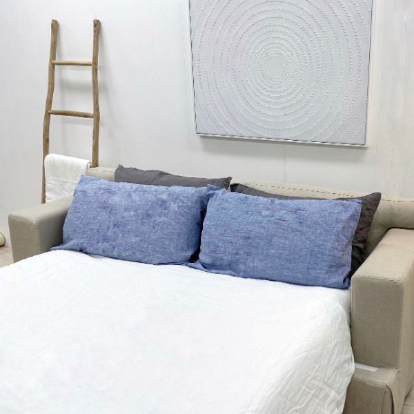 100% Linen, fully removable & washable cover. Timber frame. Memory Foam seat cushions with a feather topper Back cushion pure feather for extra comfort. To open the bed please pull up on the bar at the front.